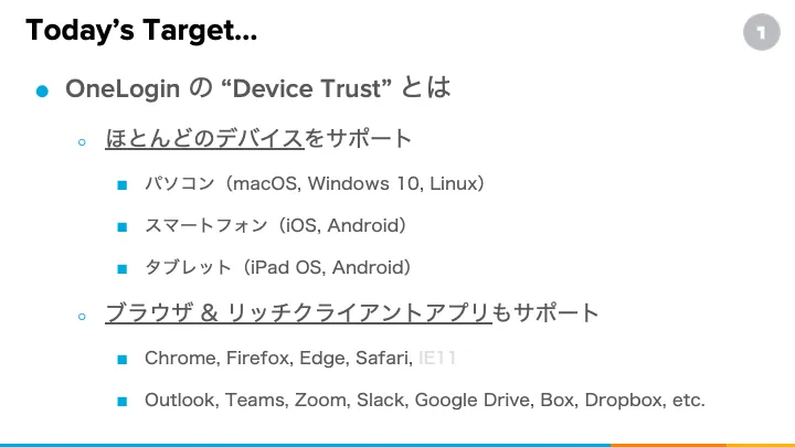 発行されたデバイス証明書を使って、OneLoginへのログインMFA認証に利用することで、会社デバイスでのみクラウドサービスへの接続ができる環境を実現できるということで、本セミナーではデバイス証明書によるMFA認証機能紹介と、ログイン判定するポリシーの自動設定機能を紹介しました。