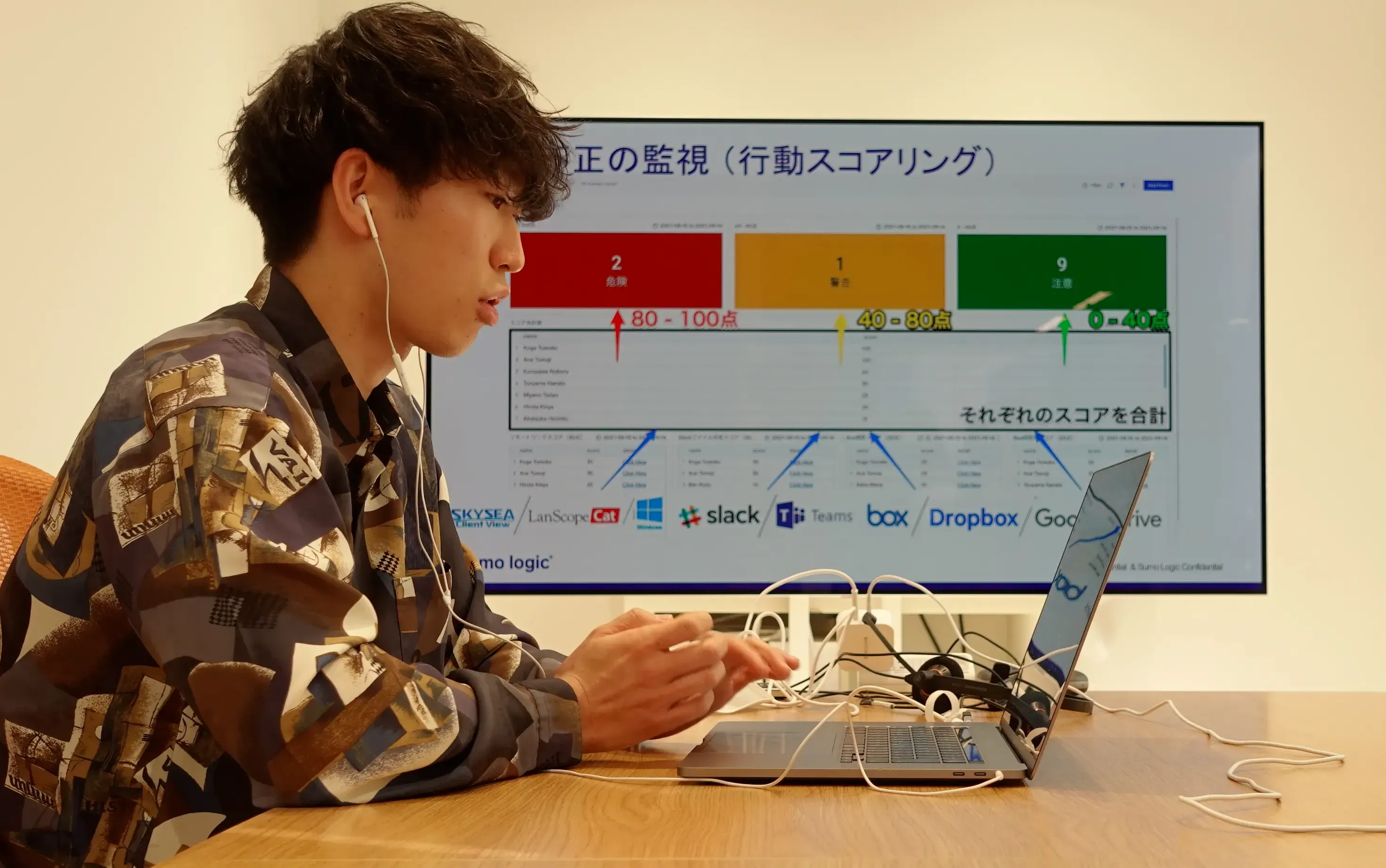 Sumo Logicは複数の業務アプリケーション利用をログデータからスコア化し、不正行為予兆を導き出すことができます。