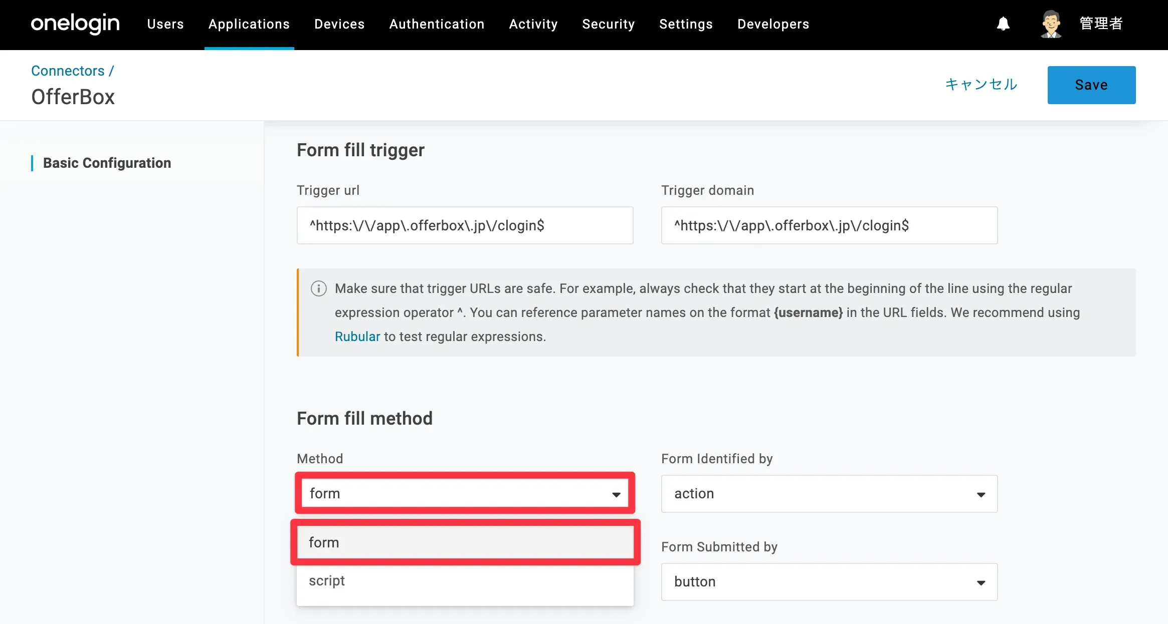 Form-basedは、ID/PW方式のログインを本人に代わってOneLoginが代理ログインを実現する方式です。類似するサービスにパスワードマネージャーがありますがこれはログイン操作を本人自身が操作するために利便性に劣ります。Form-Based方式の利用設定では、クラウド側のアプリケーションサービス設定の変更が不要である点も導入し易さににつながります。OneLoginはこの際使用するID/PWを本人管理と管理者管理から選択することで、ユーザーがPWを知らずに利用できる点も見逃せません。