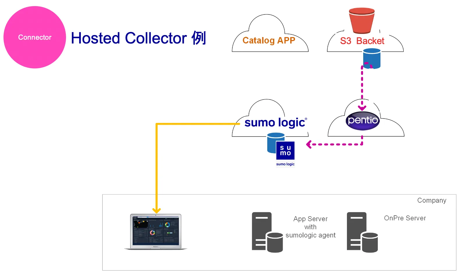 Hosted CollectorはエージェントをデプロイせずにSumo Logicへデータを送信できます。Hosted CollectorはSaaS製品からクラウド間でログを収集できたり、HTTPのエンドポイントを作成してログの受け口を作成することが可能です。