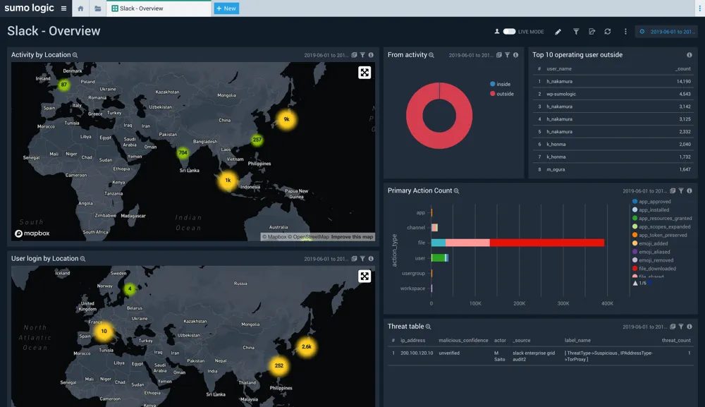 Slack上で操作が行われた位置を地図上に表示します。社内および社外での操作の比率や、社外での操作の多いユーザー、社外でのファイルダウンロードの記録を表示することができます。 OneLogin