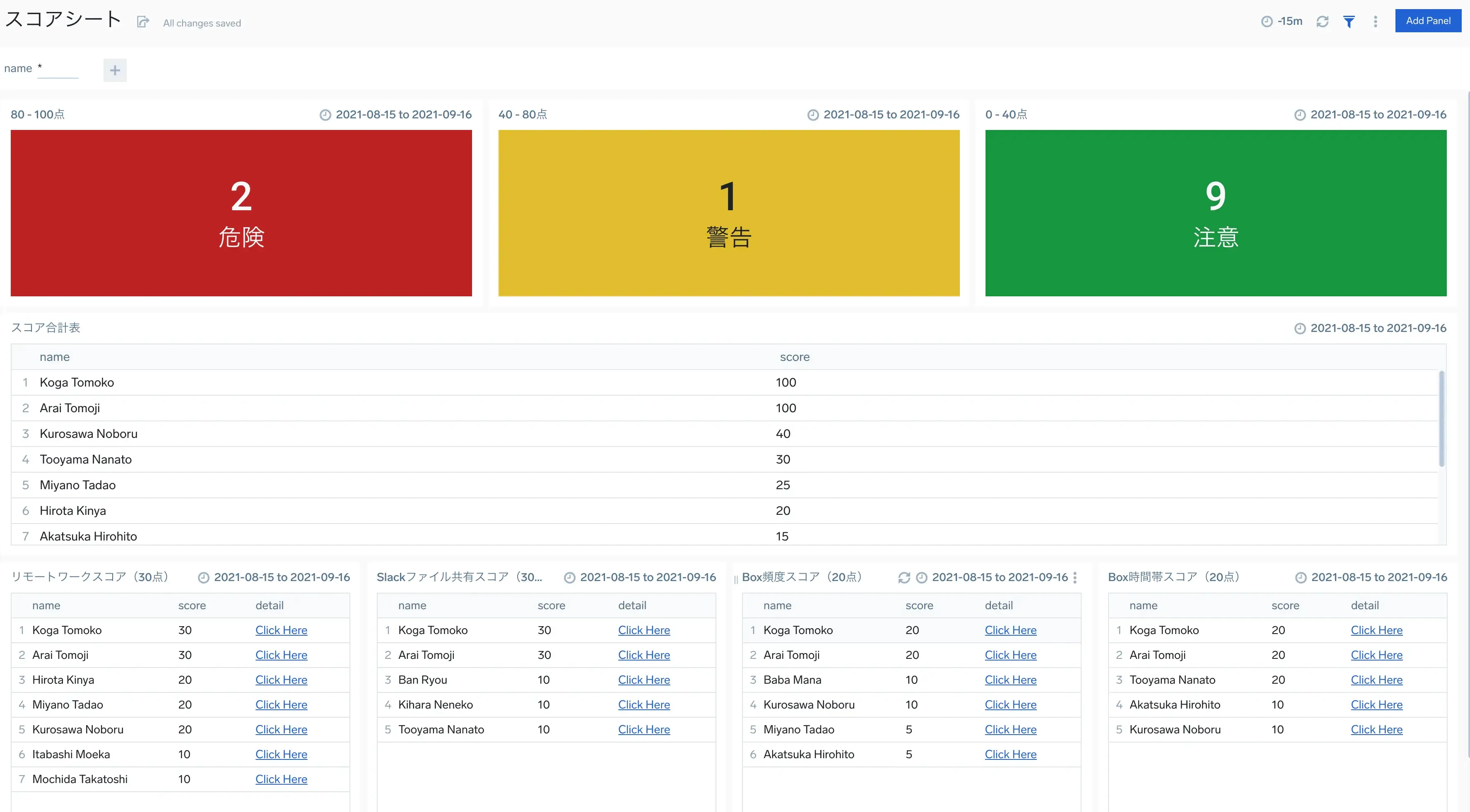 Sumo Logicでは画像のようなダッシュボードを用いて行動監視を行います。 今回のダッシュボードから、2名の危険者、1名の警告者、9名の注意監視者の存在が一目で確認できます。