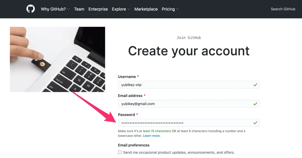 その他項目を入力するとアカウントが作成できます - Githubにサインインするとき、パスワード欄で同様にYubiKeyのボタンを「Short Touch」するとパスワードが自動で入力されます