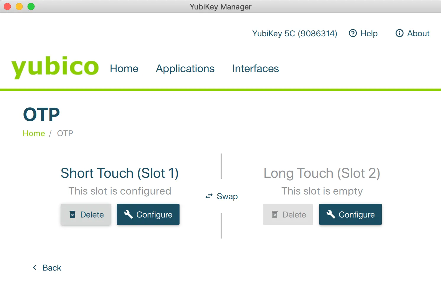 YubiKey では、ふたつの OTP を設定して操作で使い分けることができます。