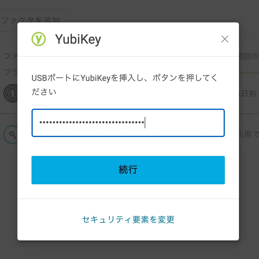 - クリックすると、セキュリティ要素を選択する画面が表示されるので「Yubikey」をクリックします